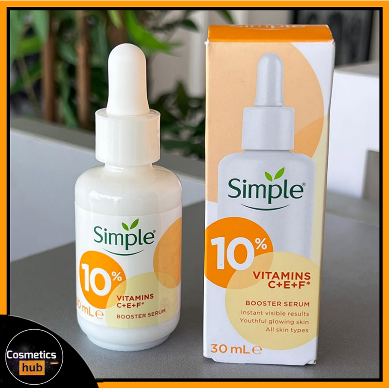 - Supercharge your skincare routine with the NEW Simple Booster Serum - 10% Vitamin C+E+F. This serum is potent yet kind Serum is our most advanced innovation yet, and works best for youthful glowing skin. The formulation has 2% active vitamin C derivative more stable than ascorbic acid, yet not irritating that brightens skin and provides antioxidant protection, 1% active vitamin E further boosting effectiveness of vitamin C that nourishes skin and helps boosts effectiveness of Vitamin C and 7% active Vitamin F that moisturises and strengthens skin barrier. Vitamin C+E+F Serum is 95% naturally derived, 91% biodegradable that’s non greasy and non-sticky and feels absolutely light on skin Like all other Simple products, the booster serums contains no colour or dye, no alcohol, no parabens, no mineral oil and no artificial perfume. We’re dermatologically tested and approved, and ophthalmologically tested. Specially designed for sensitive skin users, we’re tested and approved hypoallergenic and non-comedogenic. At Simple, we’re all about Clean Beauty with 100% efficacy! And it’s really SIMPLE – no skin irritants, only skin loving ingredients as we know what we leave out of our products is just as important as what we put in! In fact, we only include ingredients that downright love your skin and respect its natural balance and build it further. Because all skin can be sensitive at times; pollution, stress, irritants, changing weather, lack of sleep and city living, there’s a million reasons why your skin can feel a little sensitive and need the extra care and kindness. And we believe Clean Beauty is Simple, even for sensitive skin