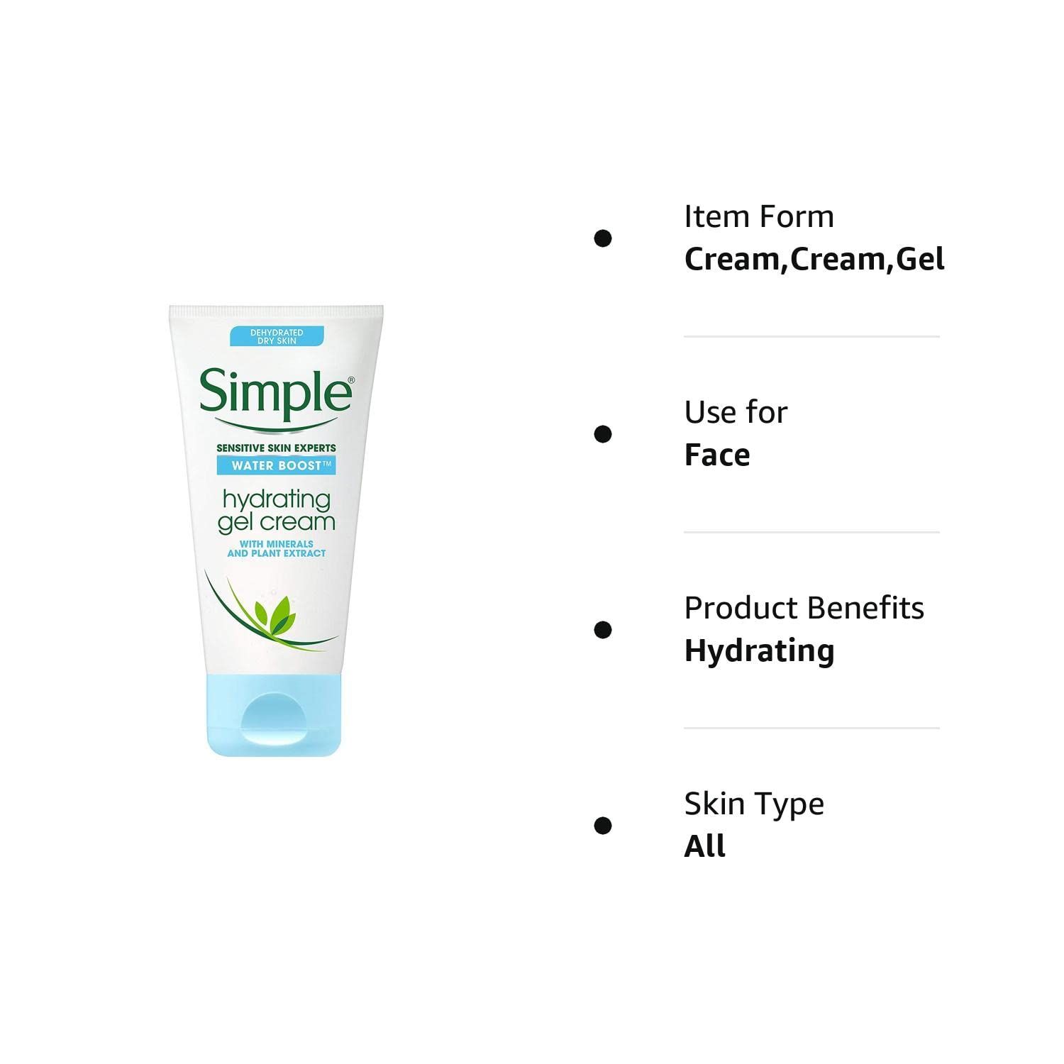 Simple Water Boost Hydrating Gel Cream’s ultra-light and refreshing formula works throughout the day, to deliver instant, continuous hydration, leaving skin smooth and dewy fresh. It delivers instant moisture to thirsty skin, reversing dehydration symptoms such as dry or dull-looking skin and leaving it looking and feeling healthy, smooth and revitalised. Made with skin-loving ingredients, minerals and a plant extract and no harsh chemicals, it’s perfect for sensitive, dry or dehydrated skin. Our water Boost Hydrating Gel Cream contains no harsh chemicals, artificial colour or perfume that can upset your skin, making it perfect for even sensitive skin. This hydrating gel facial cream is one of our best face moisturizers to smoothe away tightness and dryness.