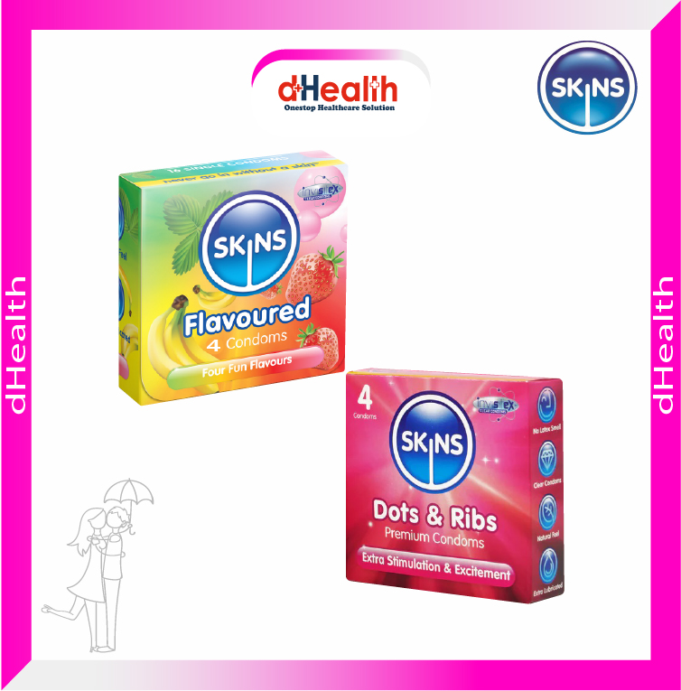 SKINS Flavored Premium & SKINS Dots & Ribs Premium Condoms 2,s Combo Pack (4x2)=8 Pcs (UK)