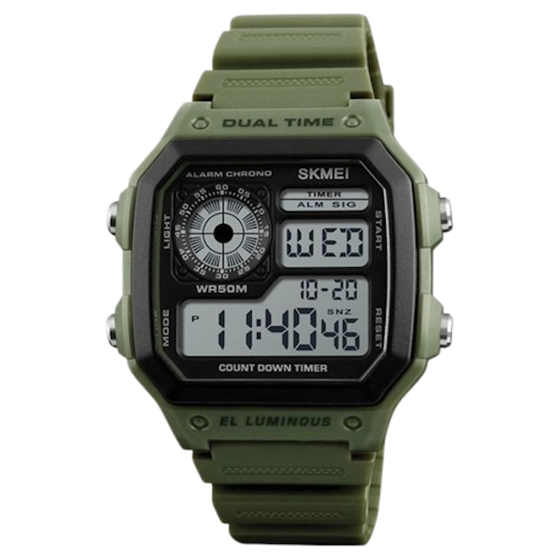 - The Skmei 1155 Gray Camo Watch for Men brings together functionality and military-inspired style. Its distinctive camouflage pattern adds a bold look, while the combination of analog and digital displays ensures easy time reading. Equipped with practical features such as stopwatch, alarm, calendar, and backlight, this watch is built for both adventure and daily routines. Water resistance provides added protection, and the durable resin strap ensures comfort for long hours of wear. Perfect for outdoor enthusiasts, sports lovers, and trendsetters alike.