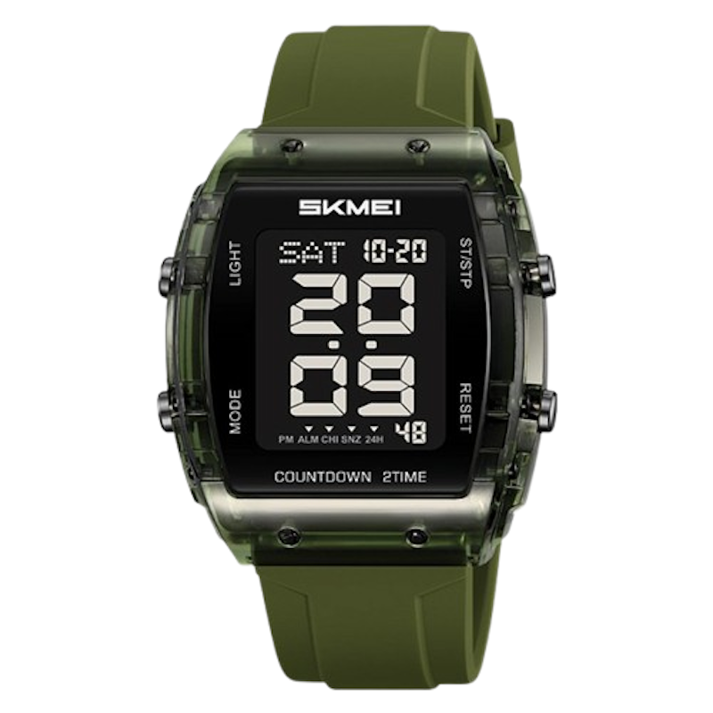 - The Skmei 2442 Olive Watch for Men brings a bold touch to your everyday style. With its modern olive green design, this watch offers digital functionality including alarm, date, and stopwatch. Engineered for durability, it is shock-resistant and water-resistant, making it ideal for both work and outdoor adventures. Comfortable, stylish, and practical, it’s the perfect companion for active men.