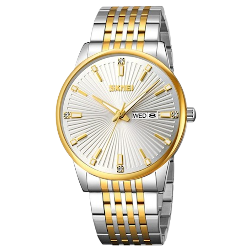 - The Skmei 9323 Silver Gold Luxury Watch for Men is crafted for those who value both sophistication and durability. Featuring a polished silver-tone body highlighted with gold accents, this watch stands out with elegance. Its reliable quartz movement guarantees accurate timekeeping, while the premium stainless-steel strap ensures lasting comfort. Whether paired with a formal suit or casual attire, this wristwatch adds a refined touch to any outfit, making it an ideal choice for modern gentlemen.