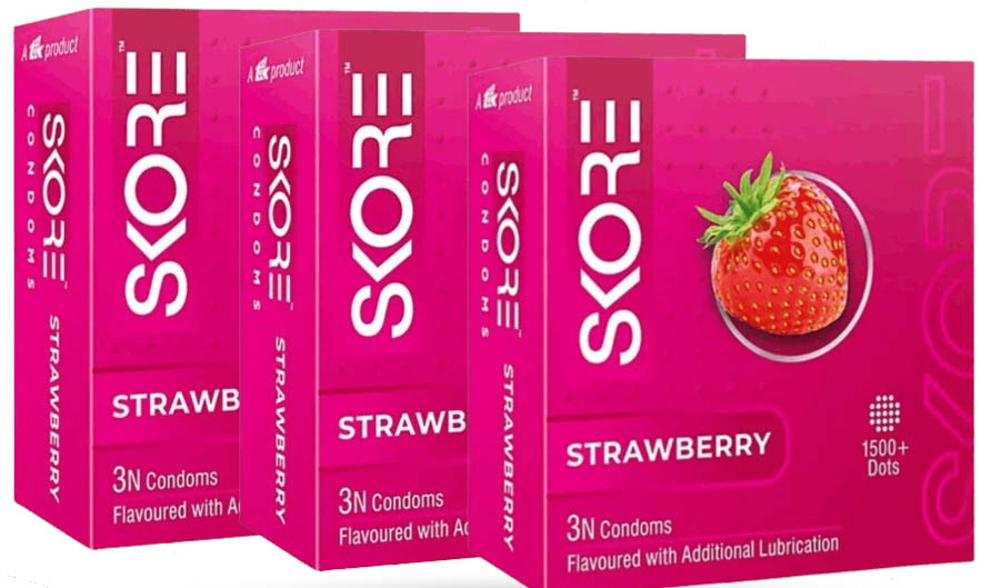 SKORE Make the fun and games last in bed with SKORE Strawberry Condoms. Its specially formulated Lubricant delays climax for men and keep you going on and on. Want more? You have over 1500 dots that make every moment special for her. So keep scoring and play the game not out.