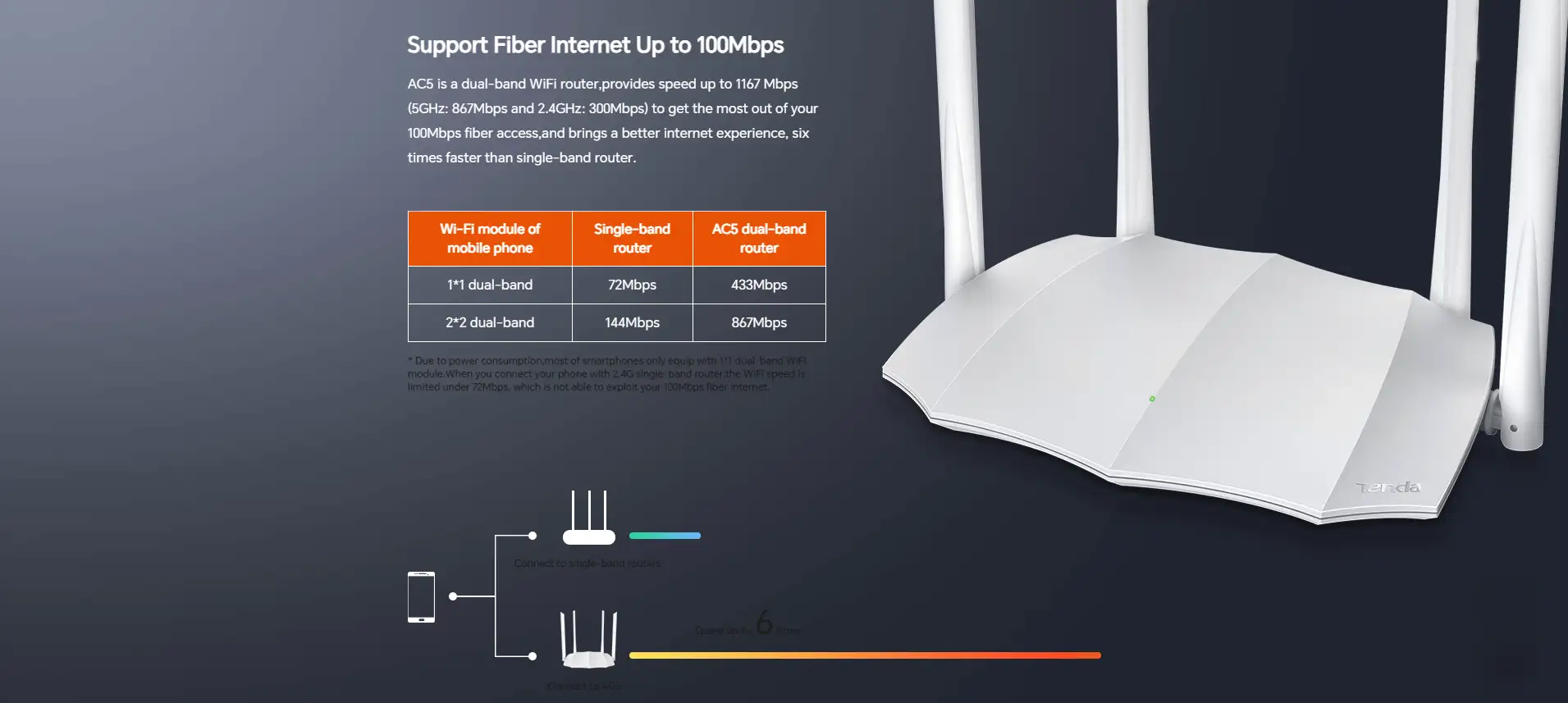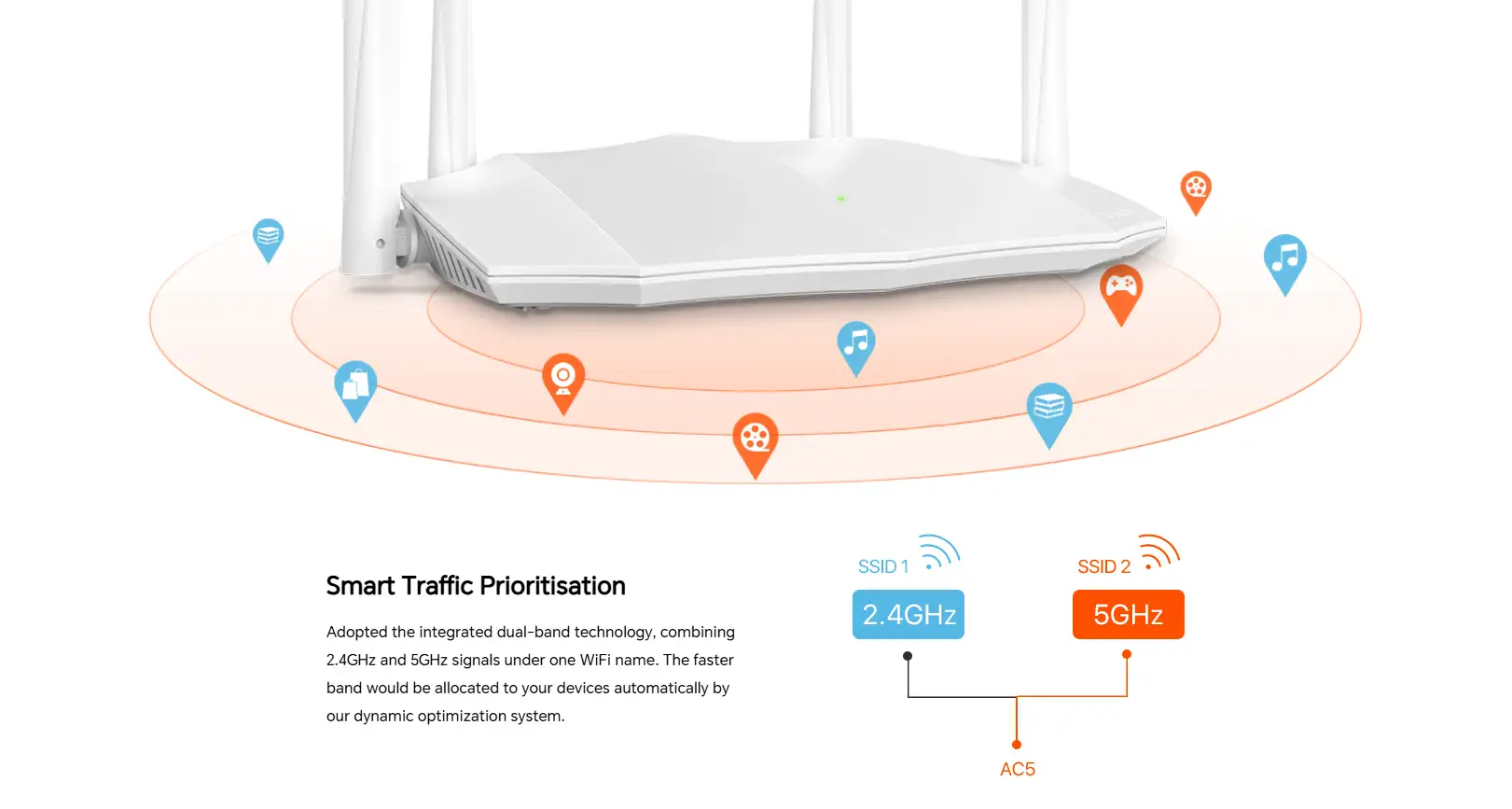 Adopted the integrated dual-band technology, combining 2.4GHz and 5GHz signals under one WiFi name. The faster band would be allocated to your devices automatically by our dynamic optimization system.