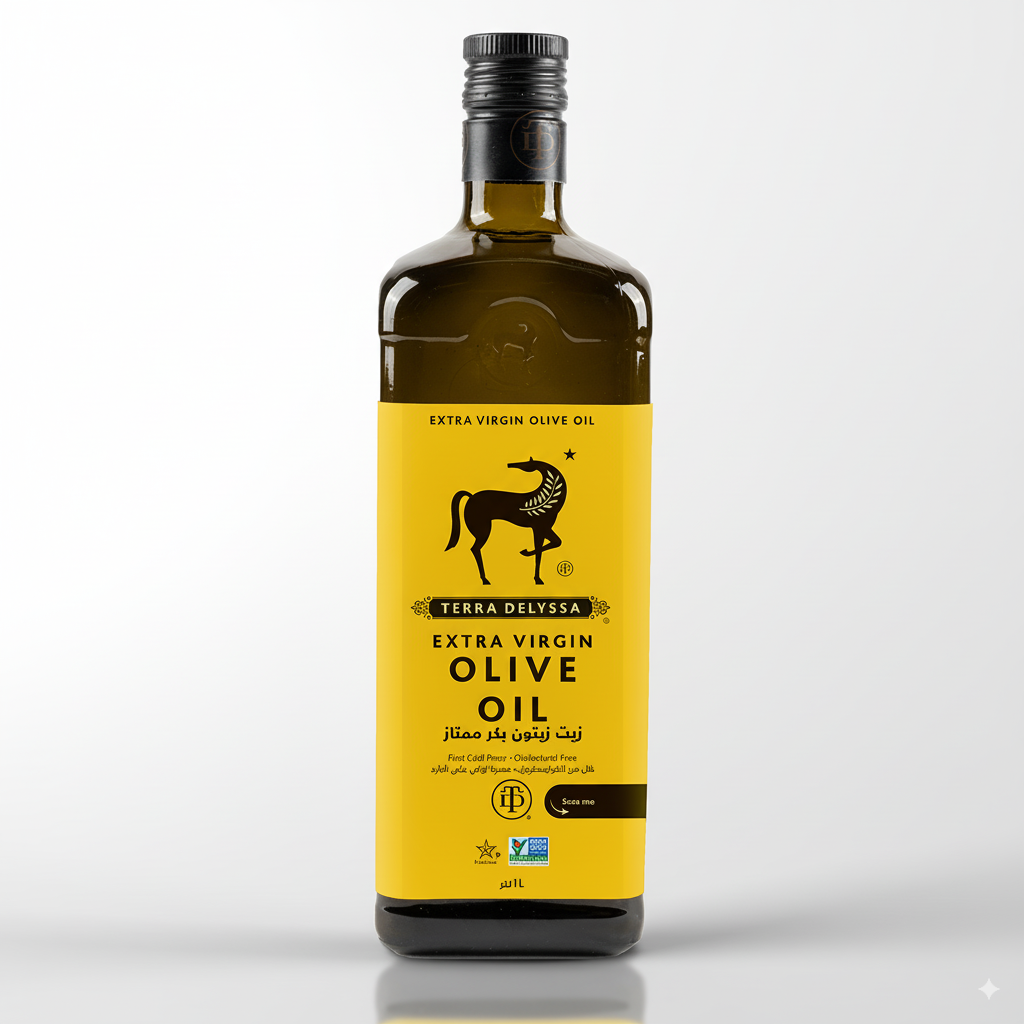 Experience the authentic taste with Terra Delyssa Extra Virgin Olive Oil (1L). Carefully crafted from the first cold press of hand-picked Tunisian olives, this oil is 100% natural, cholesterol free, and perfect for healthy cooking.