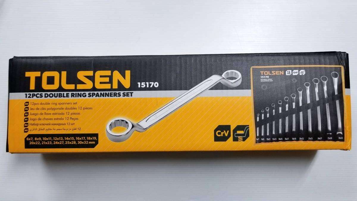 - This Tolsen 12-piece double ring end spanner set (model 15170) is a must-have for any DIY enthusiast or professional mechanic. The set includes 12 different sizes ranging from 6x7mm to 30x32mm, making it versatile for a wide range of applications. Made from high-quality CrV chrome plated material, these spanners are durable and long-lasting. The matte finish provides a non-slip grip, ensuring that you can work with confidence. The set comes packed in a convenient pouch, making it easy to store and transport. Trust in the certified original Tolsen brand for all your tool needs.