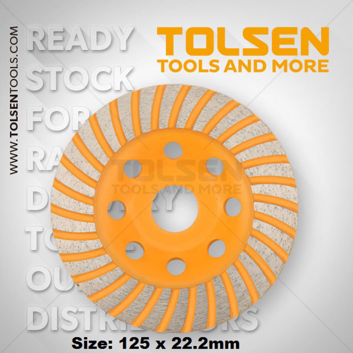 - Introducing the Tolsen Segmented Turbo Cup Grinding Wheel, the perfect power tool accessory for all your grinding and sharpening needs. This high-quality grinding wheel is made by the certified original Tolsen brand, ensuring top-notch performance and durability. With a diameter of 125mm and blade size of 20x5mm, this wheel is perfect for a variety of applications. The arbor size of 22.22mm and size of 125x22.2mm (or 5"x7/8") make it compatible with a wide range of power tools. Packaged in a convenient color box, this grinding wheel is easy to store and transport. Trust Tolsen for all your power tool accessory needs.