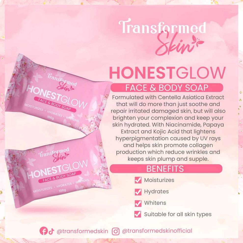 Transformed Skin Honest Glow Face & Body Soap Formulated with Centella Asiatica Extract will do more than just soothe and repair irritated damaged skin, but will also brighten your complexion and keep your skin hydrated. With Niacinamide, Papaya Extract and Kojic Acid That lightens hyperpigmentation caused by UV rays and helps skin promote collagen production which reduces Wrinkles and keeps skin plumps and supple. Transformed Skin Honest Glow Face & Body Soap is a nourishing soap bar that is designed to gently cleanse and hydrate your skin. This soap is made with natural and non-toxic ingredients, including Coconut oil, Papaya Extract, and seed oil which help to soothe and moisturize your skin, while promoting a more youthful-looking complexion. Transformed Skin Honest Glow Face & Body Soap is a nourishing soap bar made with natural and non-toxic ingredients like Coconut oil, Papaya Extract, and seed oil. It gently cleanses and hydrates your skin, promoting a more youthful-looking complexion.