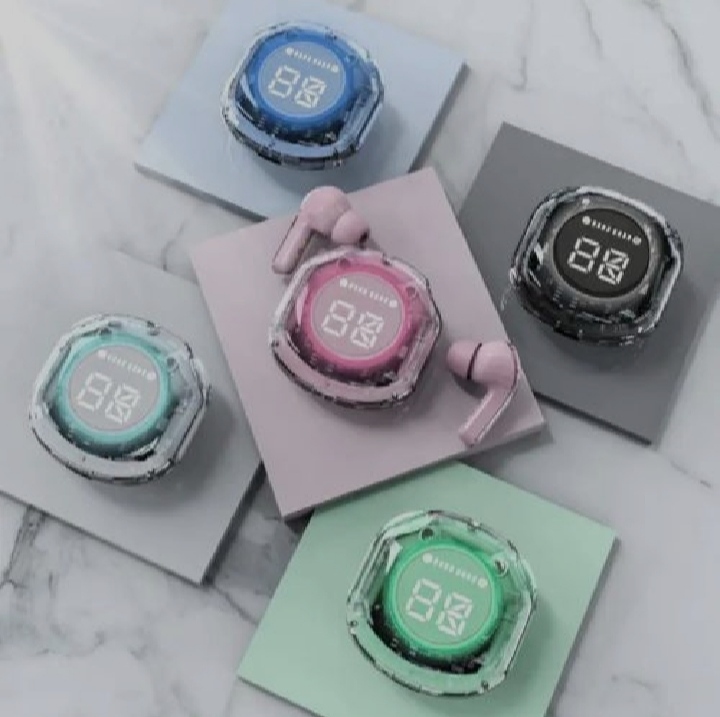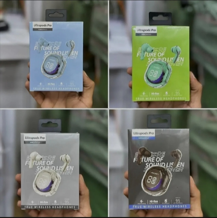 Headphone Battery: 30mAh.Charging Bin Battery: 300mAh.Touch Control Wireless.Effective Distance: 15-20M.Automatic PairLED Digital Display.Quick Charging: Only 1-2 Hours Needed for Full Charge.The Ultrapods Pro True Wireless Earbuds have a transparent design, giving them a unique and modern look that stands out.• Featuring Bluetooth 5.3, these earbuds provide seamless connectivity and deliver high-quality audio for an immersive listening experience with minimal interruptions.• Equipped with a water-resistant feature, these earbuds offer added durability and protection against sweat and light rain, making them suitable for active lifestyles.• The sleek and modern design of the earbuds is complemented by a display, adding convenience for easy control and navigation of music and calls. The display enhances the user experience by providing quick access to essential functions.The Ultrapods Pro come equipped with SVE AI technology that actively reduces background noise during calls, ensuring crystal-clear conversations no matter where you are.