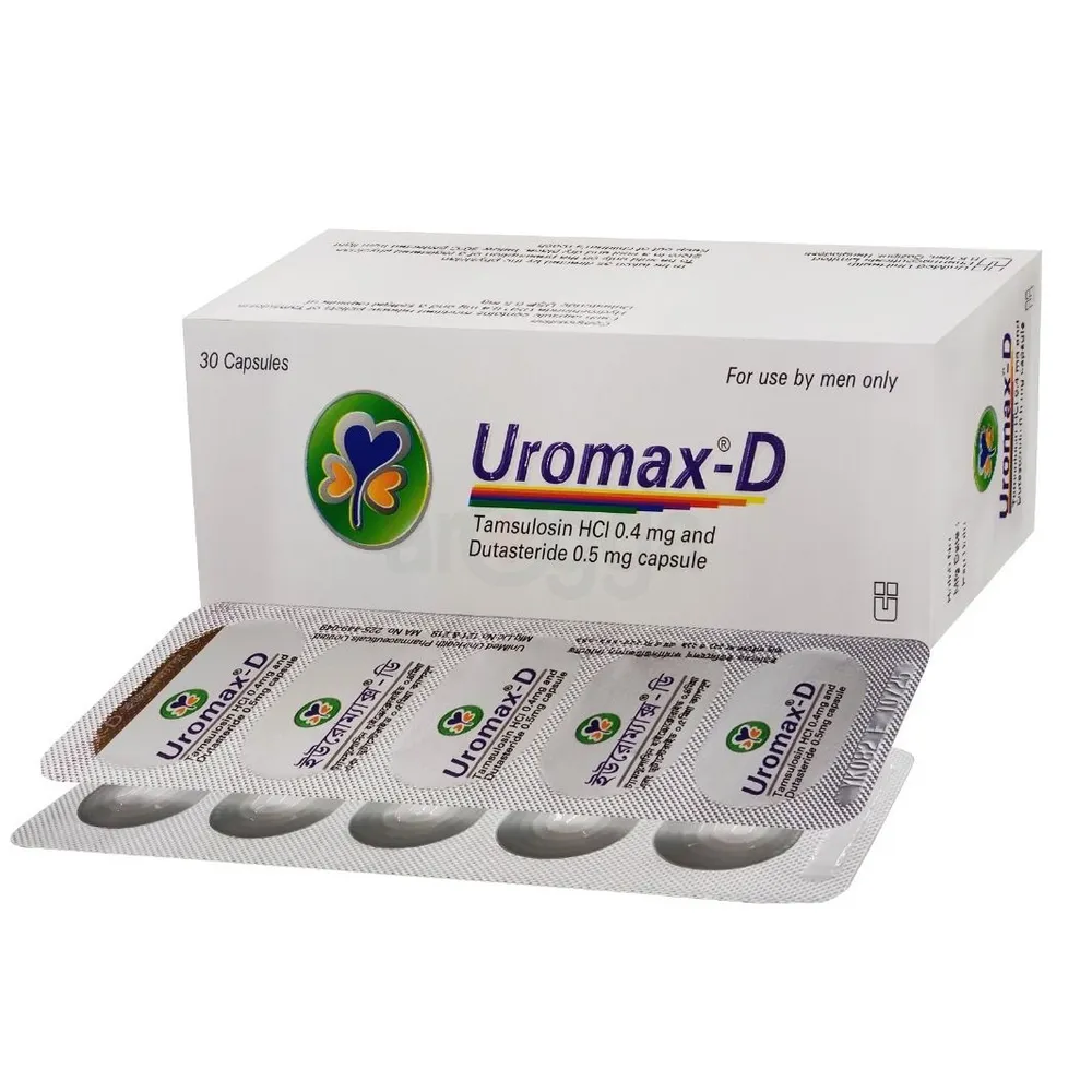 Uromax D is a combination of two medicines: Tamsulosin and Dutasteride, which relieves the symptoms of benign prostatic hyperplasia. Tamsulosin is an alpha-blocker. It works by relaxing the muscle around the bladder exit and prostate gland so as to allow easy passage of urine. Dutasteride is a 5-alpha-reductase inhibitor which helps in shrinking the prostate gland by decreasing the level of the hormone which helps the prostate gland grow.