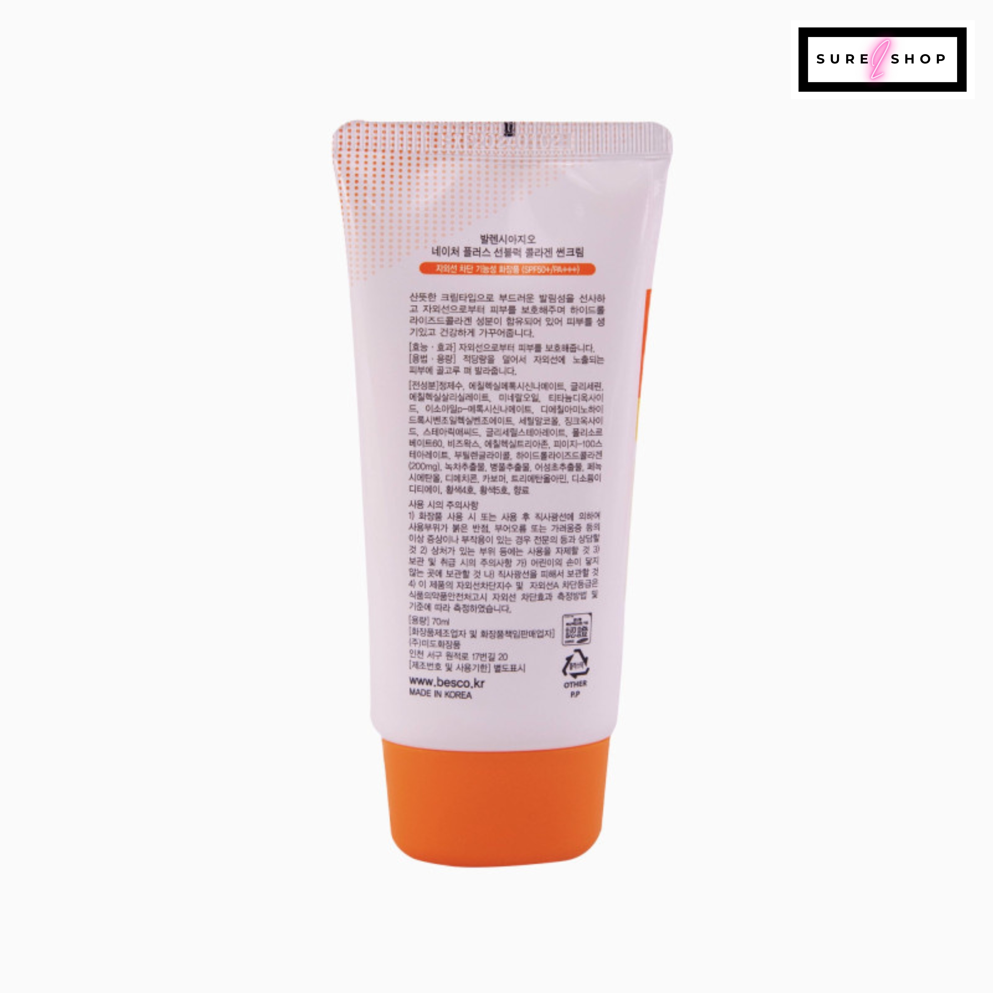Purified Water, Ethylhexyl Methoxycinnamate, Glycerin, Ethylhexyl Salicylate, Mineral Oil, Titanium Dioxide, Isoamyl p-Methoxycinnamate, Diethylamino Hydroxybenzoyl Hexyl Benzoate, Cetyl Alcohol, Zinc Oxide, Stearic Acid, Glyceryl Stearate, Polysorbate 60, Beeswax, Ethylhexyl Triazone, PEG-100 Stearate, Butylene Glycol, Hydrolyzed Collagen (200Mg), Green Tea Extract, Centella Asiatica Extract, Eoseongcho Extract, Phenoxyethanol, Dimethicone, Carbomer, Triethanolamine, Disodium EDTA, Yellow No. 4, Yellow No. 5, Fragrance .