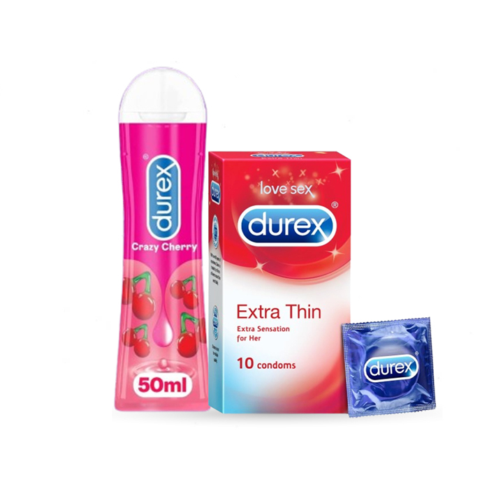 Valentine Day Special Combo Pack | Durex Crazy Cherry Flavor Water-based Lube 50ml & 10pcs/ 3pcs Durex Extra Thin Condom | Condom & Lube Combo for Valentine Lover Couple, Married Couple Gift