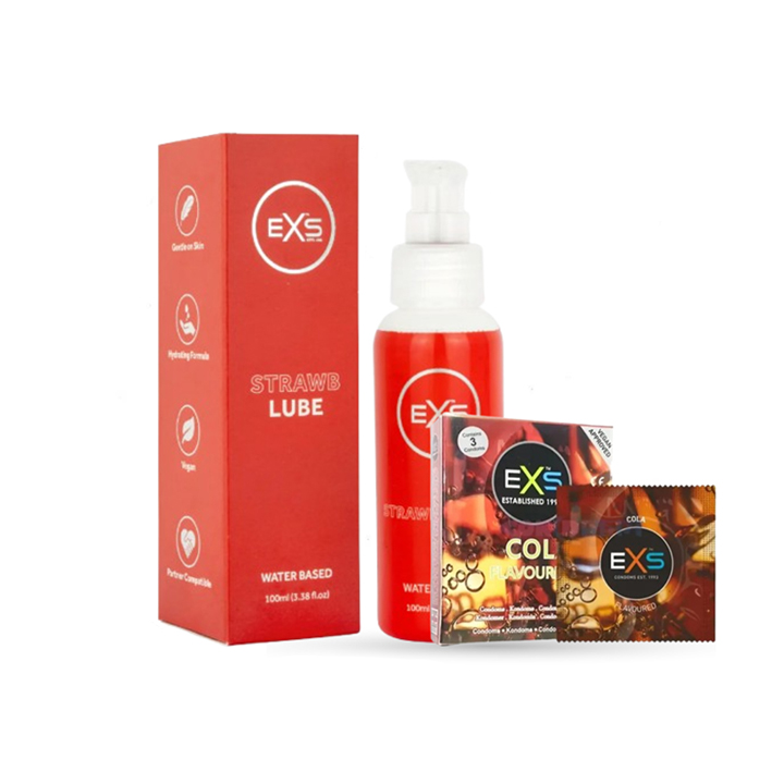 Valentine Day Special Combo Pack | EXS Strawberry Flavor Water-Based Lube 100ml & EXS Cola Flavor Condom 3pcs Pack | UK | Condom & Lube Combo for Valentine Lover Couple, Married Couple Gift