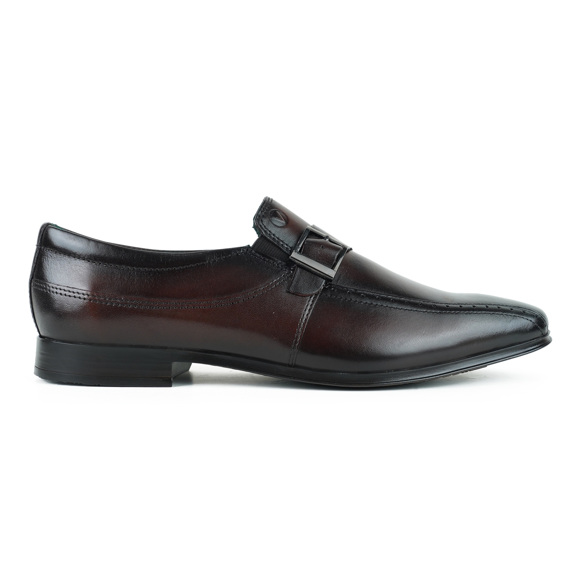 This sleek, lace-free dress shoe features a refined leather upper and a durable rubber sole for reliable comfort and traction. The stylish metal trim design on the upper adds a sophisticated touch, making it ideal for formal events and professional settings.