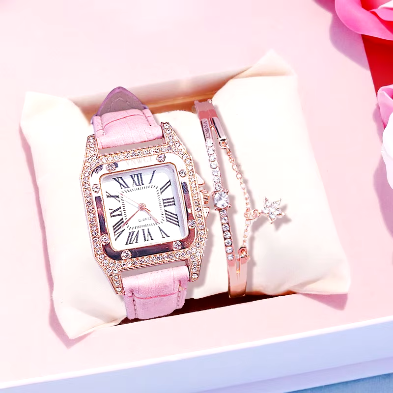**Elegant Design and Craftsmanship** The Women Diamond Watch Starry Luxury Bracelet Set is a testament to exquisite craftsmanship and timeless elegance. The watch features a round case with a diameter of 3.6cm, encrusted with sparkling diamonds that catch the light beautifully. The alloy case is paired with a leather band, offering both durability and a touch of luxury. The watch's design is complemented by a buckle clasp, ensuring a secure fit for the wearer. **Versatile and Practical** This watch is not just a statement piece; it's a practical accessory for the modern woman. The quartz movement ensures precise timekeeping, while the 3Bar water resistance depth makes it suitable for everyday wear, including light rain or splashes. The watch's versatile design makes it an ideal choice for various occasions, from casual outings to more formal events. The watch's small wrist-friendly size makes it a perfect fit for those with petite wrists, ensuring comfort and style. **A Gift of Elegance** Looking for a thoughtful gift for a special someone? The Women Diamond Watch Starry Luxury Bracelet Set is an excellent choice. The watch's sophisticated design and practical features make it a gift that will be cherished for years to come. Whether it's for a birthday, anniversary, or just because, this watch is sure to delight any woman who appreciates both fashion and functionality.